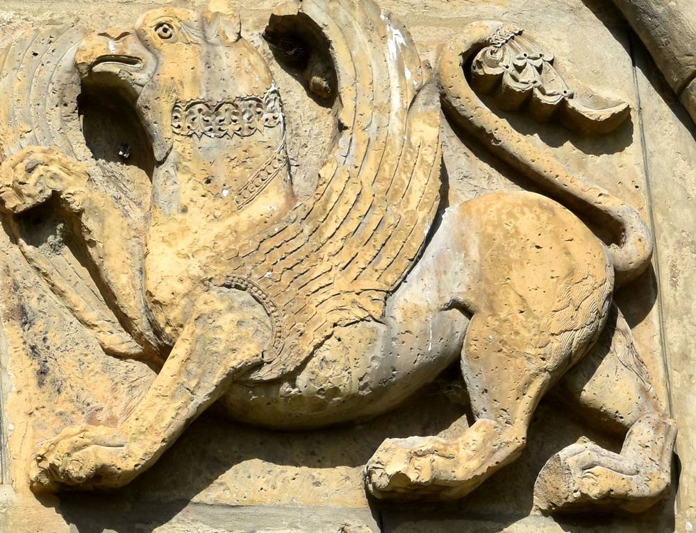 На главной оси восточного фасада расположены декоративные ромбики, обрамленное орнаментом окно и высокий крест. Эта исключительно уравновешенная композиция, многократно повторяясь в течение нескольких столетий и, конечно, с видоизменениями, просуществовала почти до конца XVIII в. Но, пожалуй, из всех декоративных элементов памятника самым эффектным является барельеф с изображением грифона. Он расположен высоко в правой арке фасада. Первоначально ему отвечал второй грифон, симметрично украшавший левую арку и погибший во время реставрации прошлого века.